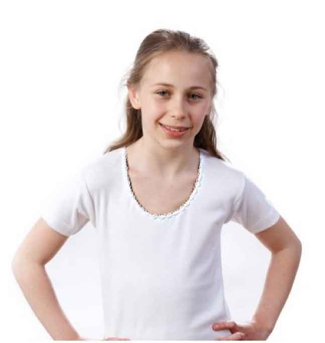 3 maglia bimba manica corta 236 in caldo cotone interlock leggermente felpato all' interno. Scollo tondo con piccolo pizzo macramè in filo. Prodotto lavabile in lavatrice a 60°, ottima resa al lavaggio. Prodotto in Italia. Confezioni da 3 pezzi.