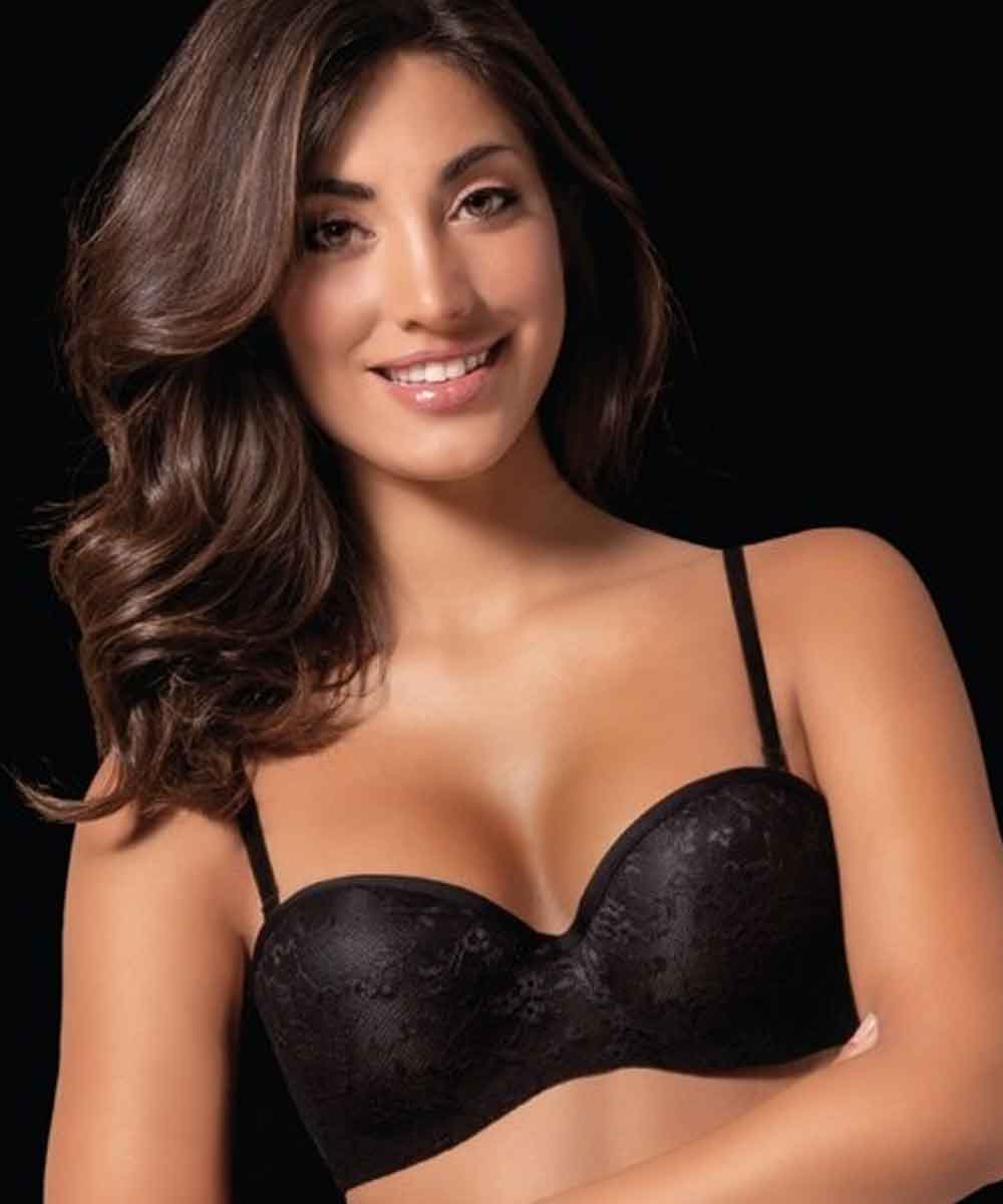 Reggiseno a fascia in pizzo con coppa graduata, con ferretto e spalline staccabili. Grazie al sostegno interno in silicone dona maggior supporto e volume al seno. Particolarmente indicata per top e abiti a fascia.