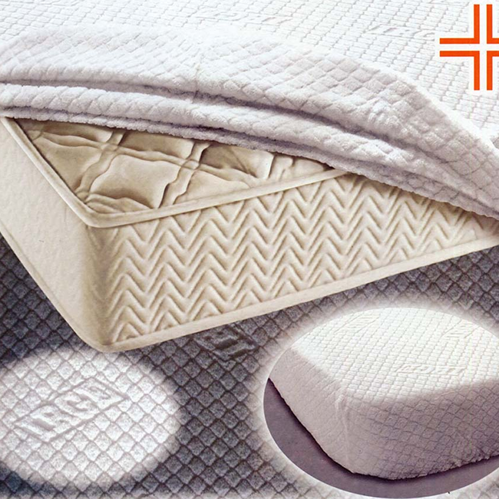 Il coprimaterasso è realizzato in spugna jersey estendibile con disegno jacquard. Molto particolare è la trama del tessuto con logo IRGE a rilievo: simbolo dell’esclusività e dell’autenticità del prodotto.