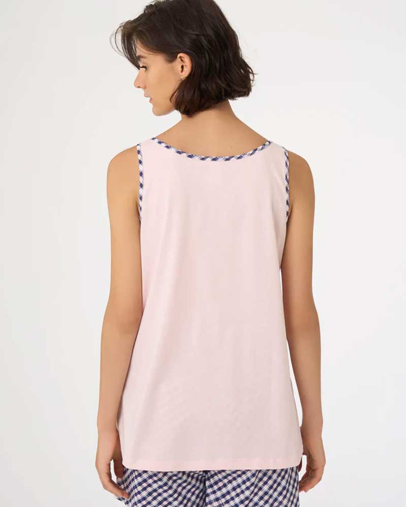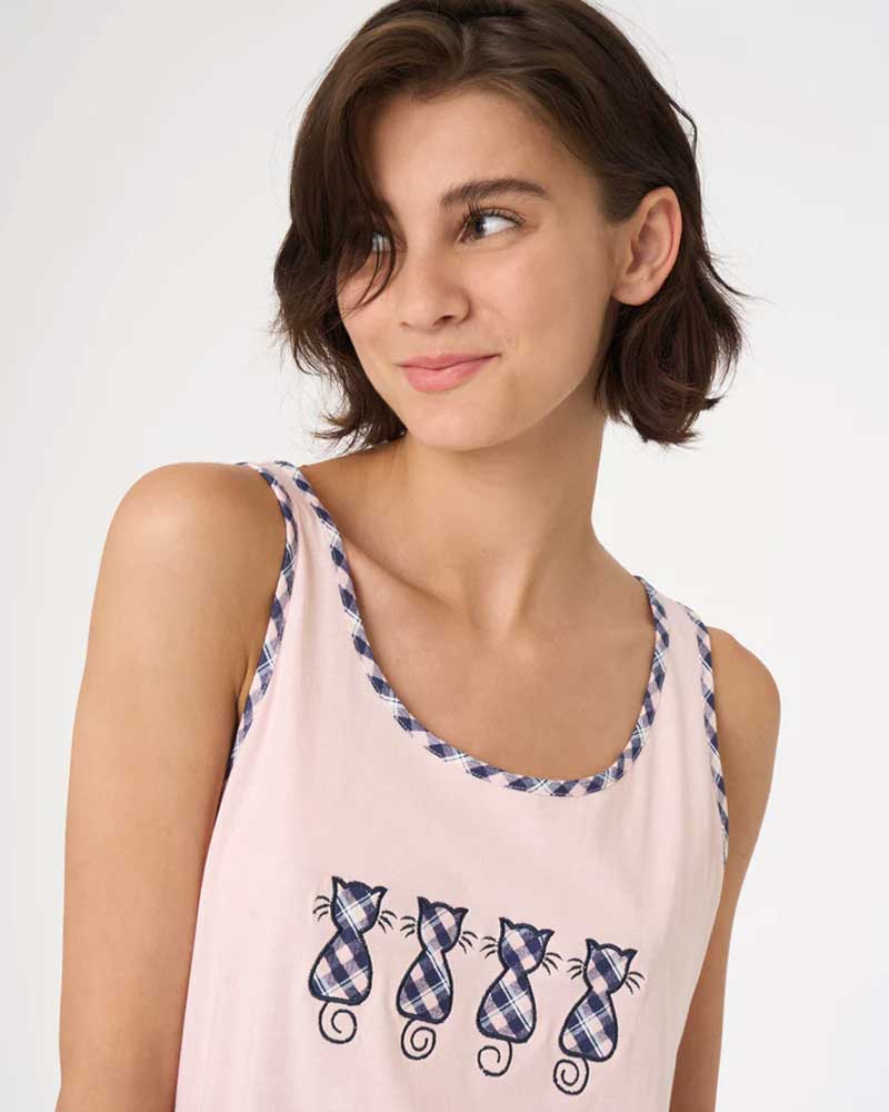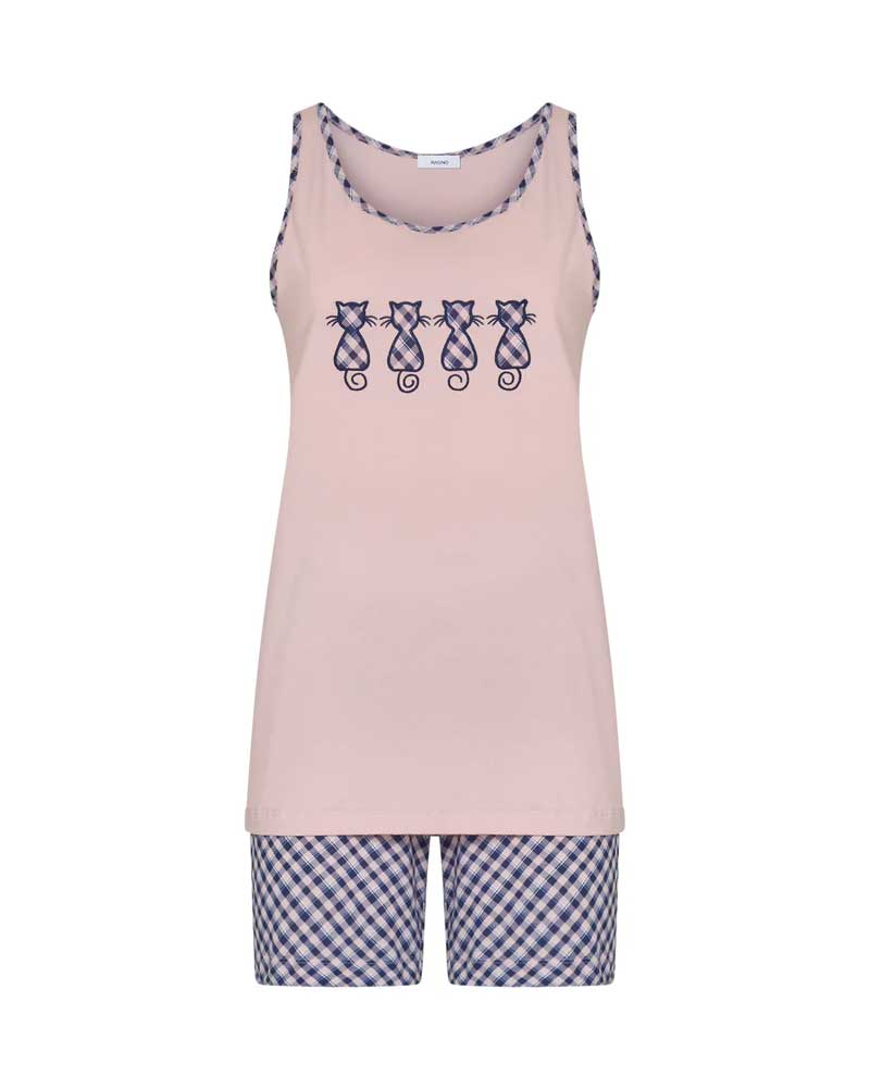 Il pigiama corto da donna a spalla larga DF97NA di Ragno è un mix di comfort e stile. La canotta a tinta unita è presentata con bordi a contrasto in stampa check e gattini sulla parte centrale del capo, creando un mix di colori e fantasie che renderanno le notti ancora più divertenti e spensierate.