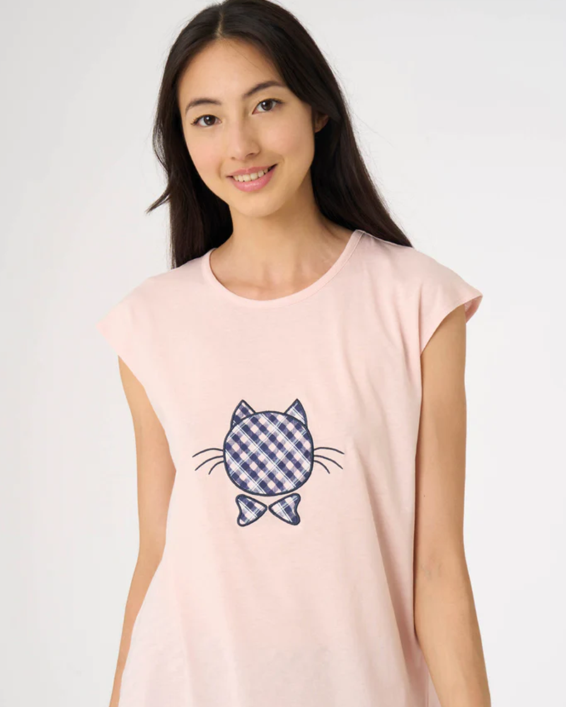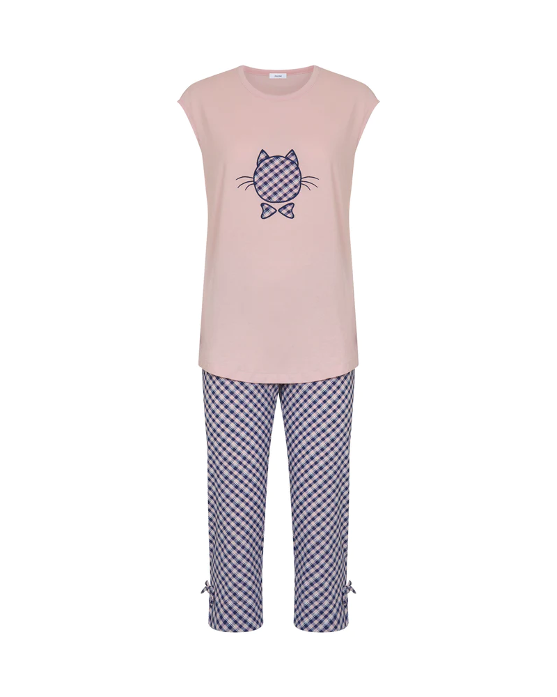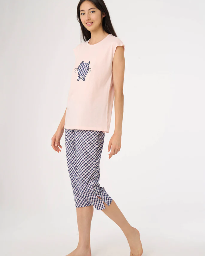 Il pigiama corto a pinocchietto da donna DF97NB di Ragno è perfetto per le notti estive. La maglia con manica a kimono è presentata con un'adorabile applicazione nella parte centrale del capo raffigurante il muso di un gattino in fantasia check, creando un look dolce e originale.