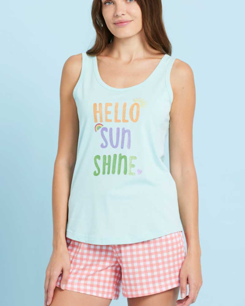 La canotta spalla larga, di colore acquamarina, caratterizzata da una scritta sul petto, dona un tocco di stile e originalità al pigiama.