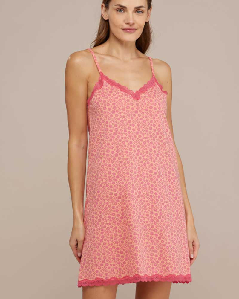 La camicia da notte LA2752AS spalla stretta, di colore corallo, caratterizzata da dettagli con fiorellini, e dettagli in pizzo, dona un tocco di stile e originalità al pigiama, dal design semplice ed elegante, completa il look.